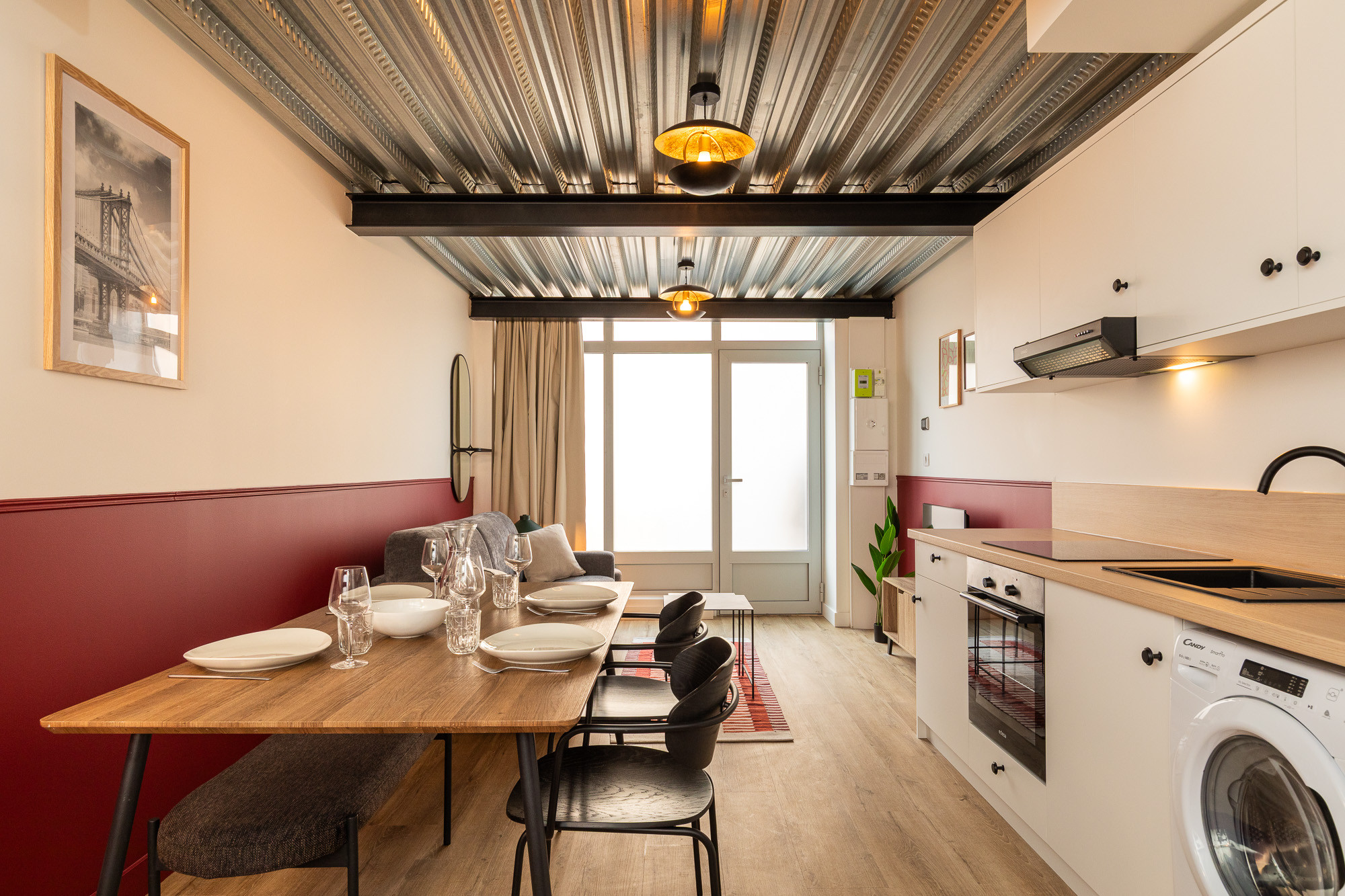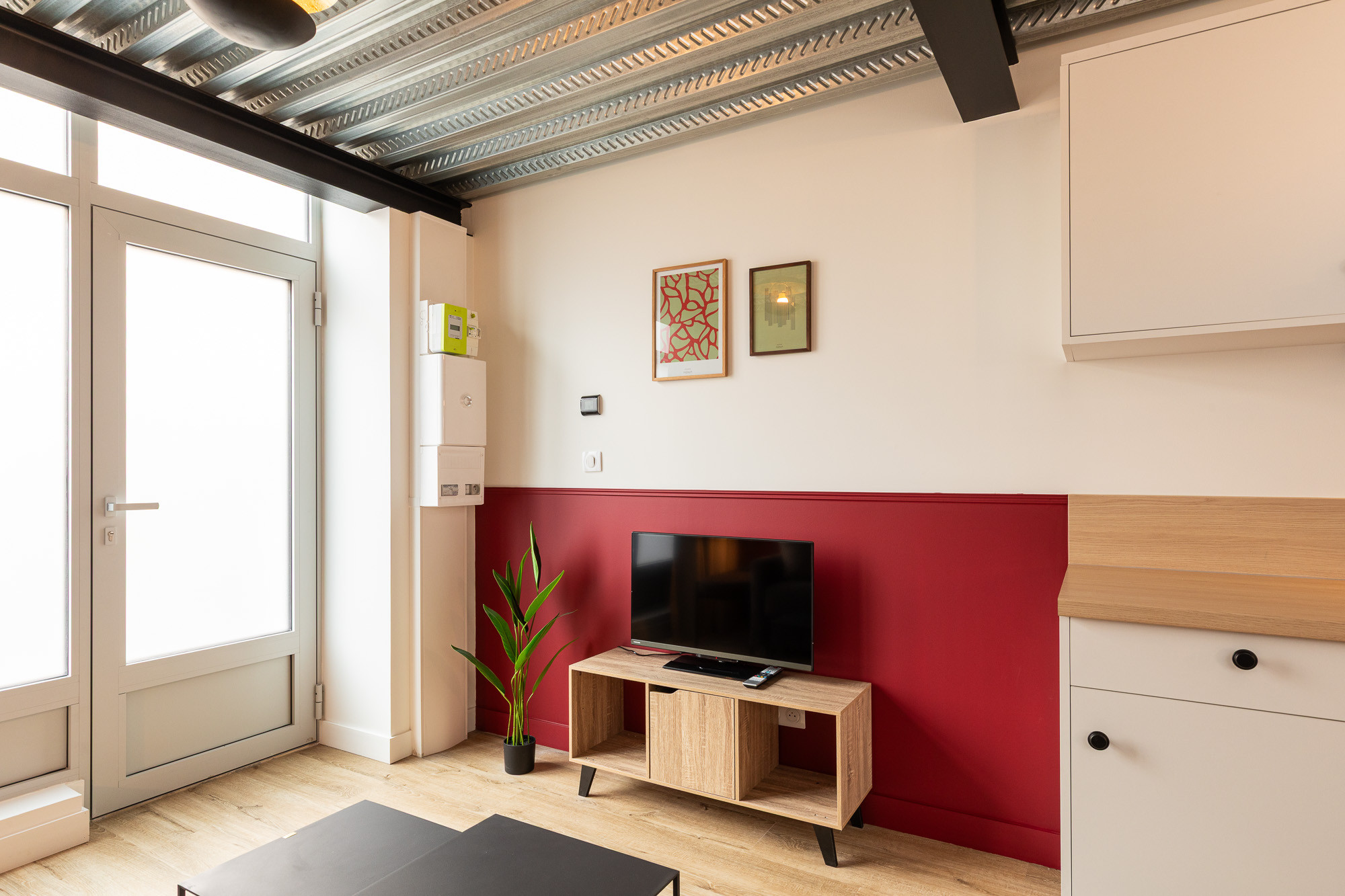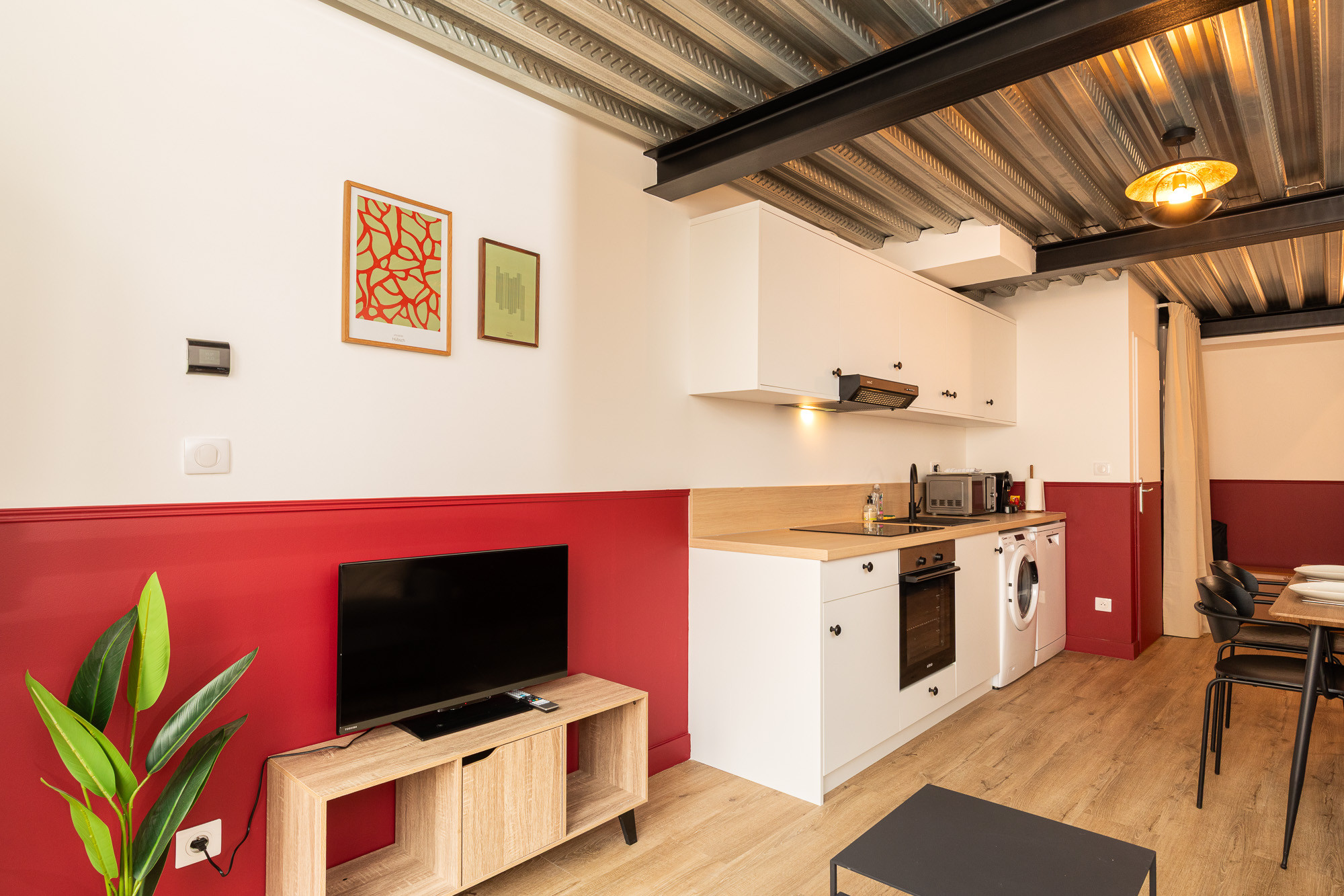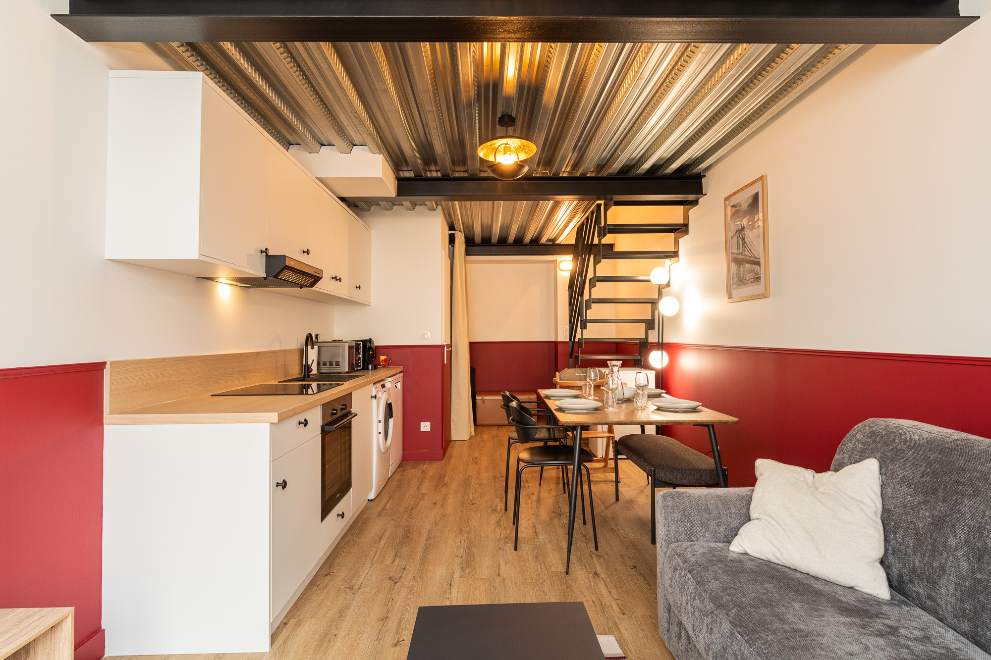 Au rez-de-chaussée, côté rue, vous trouverez le salon ainsi qu’une cuisine ouverte entièrement équipée. L’espace de vie est convivial et fonctionnel, idéal pour partager un repas ou se détendre.