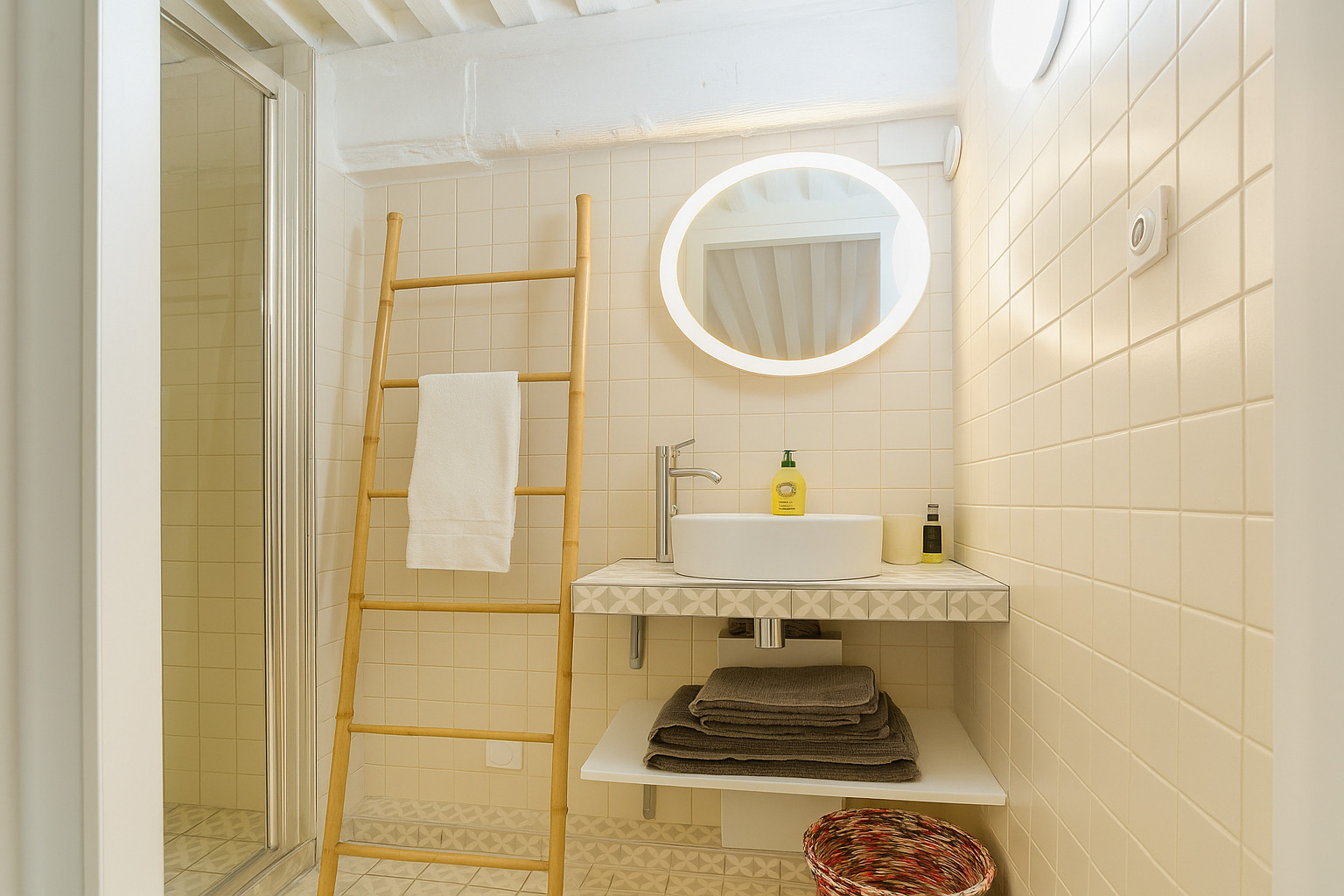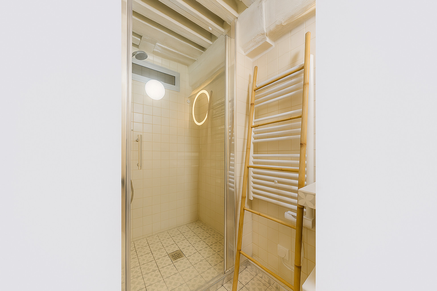 - Miroir, meuble de rangement, sèche-serviettes, sèche-cheveux
