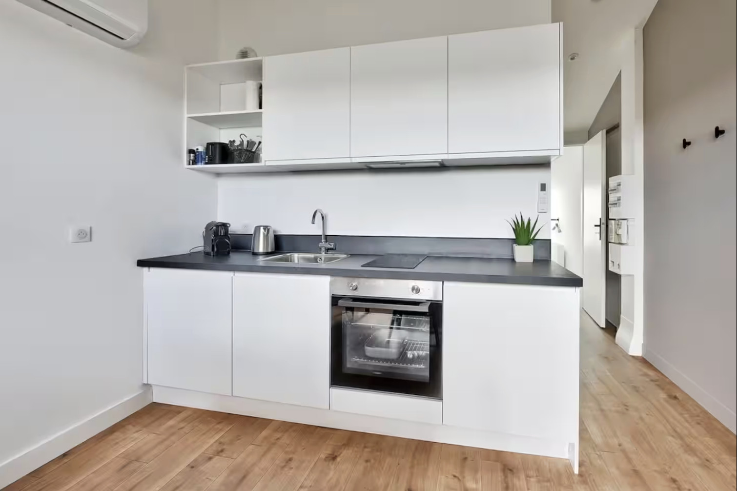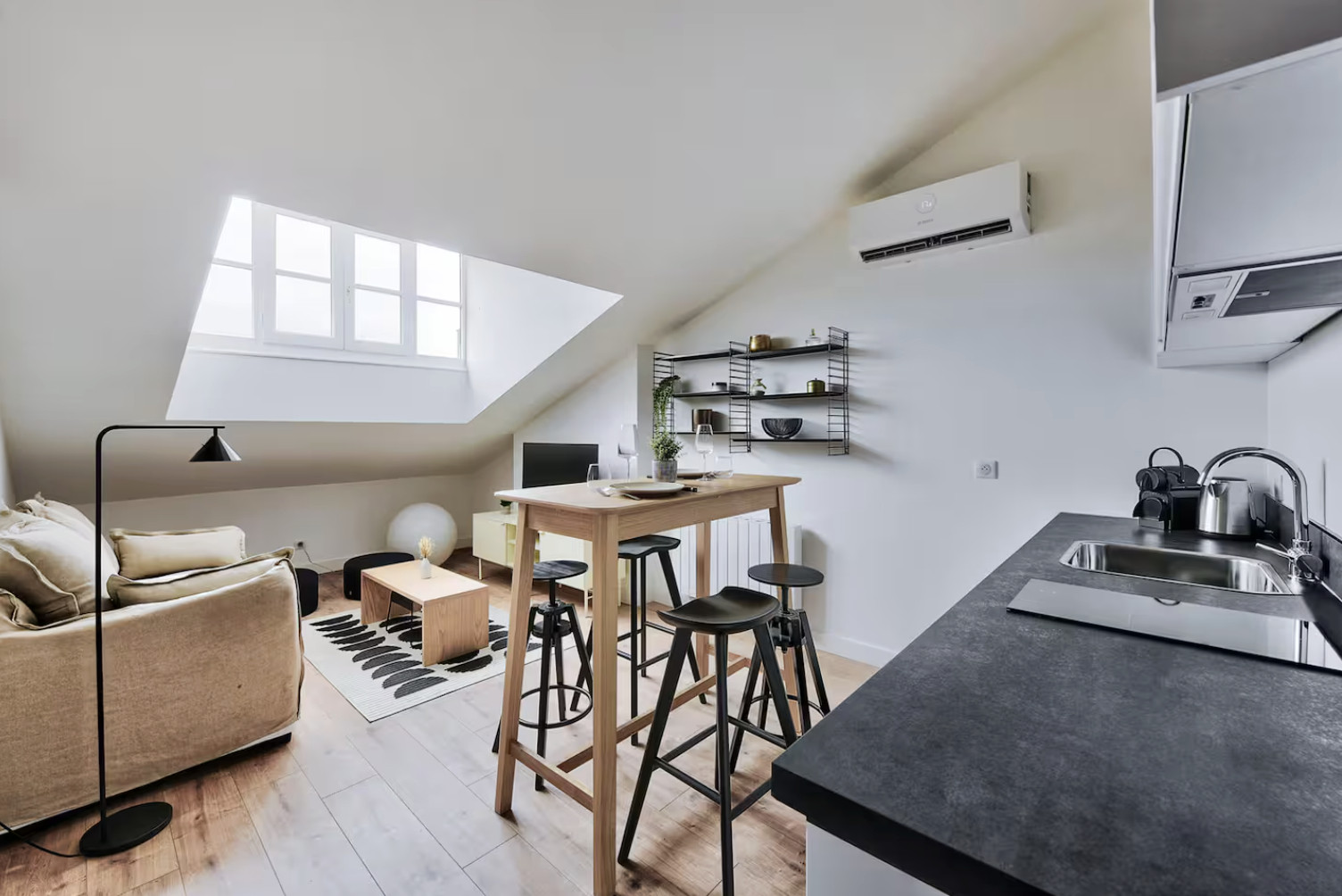 - Cuisine ouverte équipée : four, plaques électriques, réfrigérateur/congélateur, lave-vaisselle, micro-ondes, Nespresso, bouilloire, grille-pain, ustensiles de cuisine