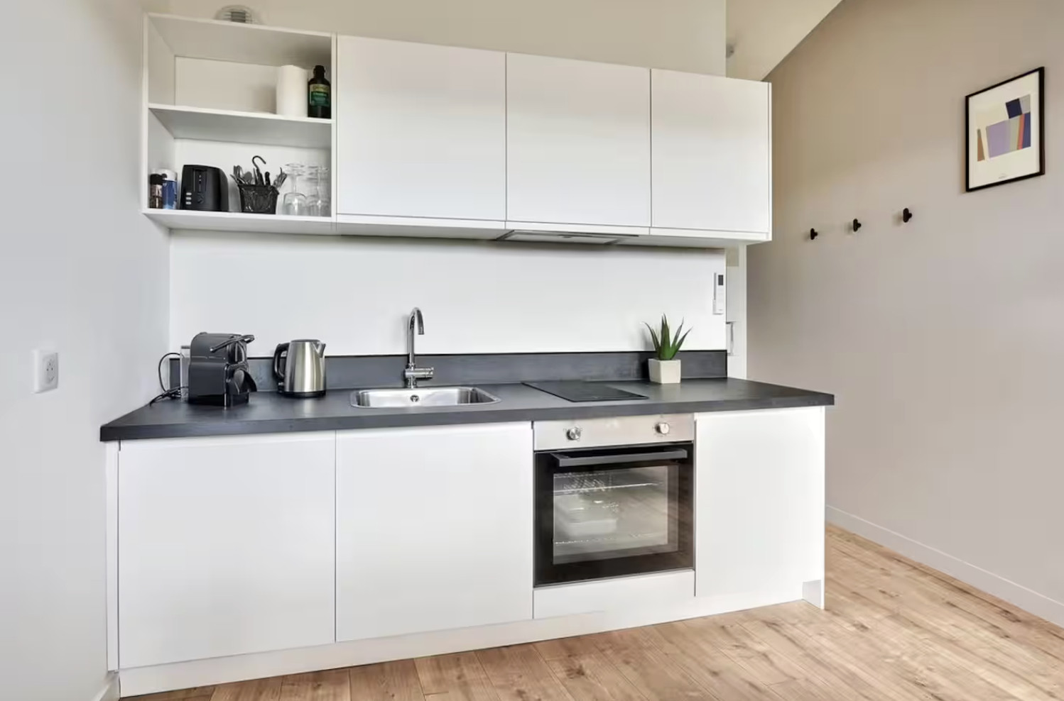 ✔ Cuisine équipée : four, micro-ondes, plaques de cuisson, ustensiles, grille-pain, bouilloire, machine à café