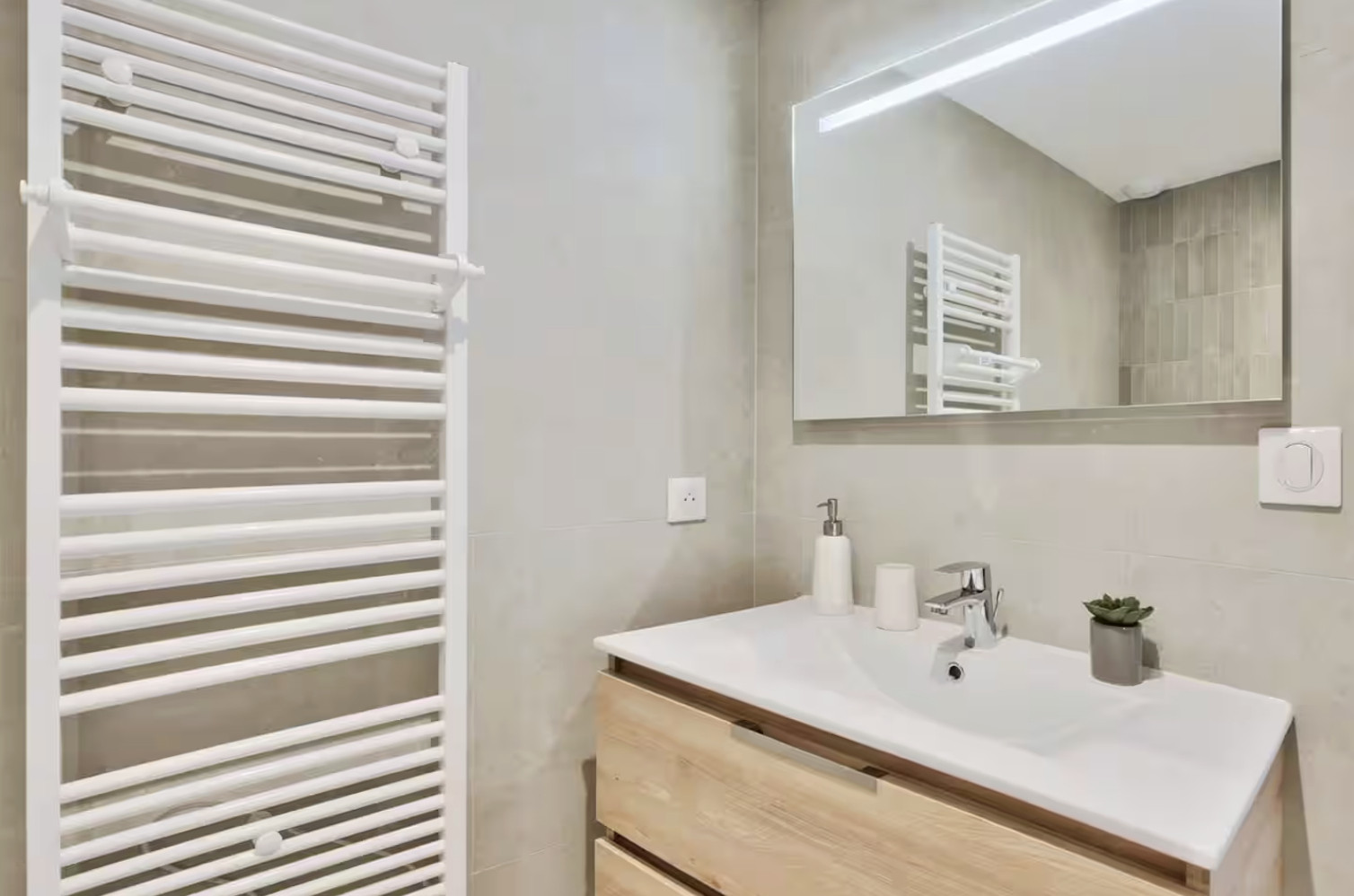 - Miroir, meuble de rangement, sèche-serviettes, sèche-cheveux