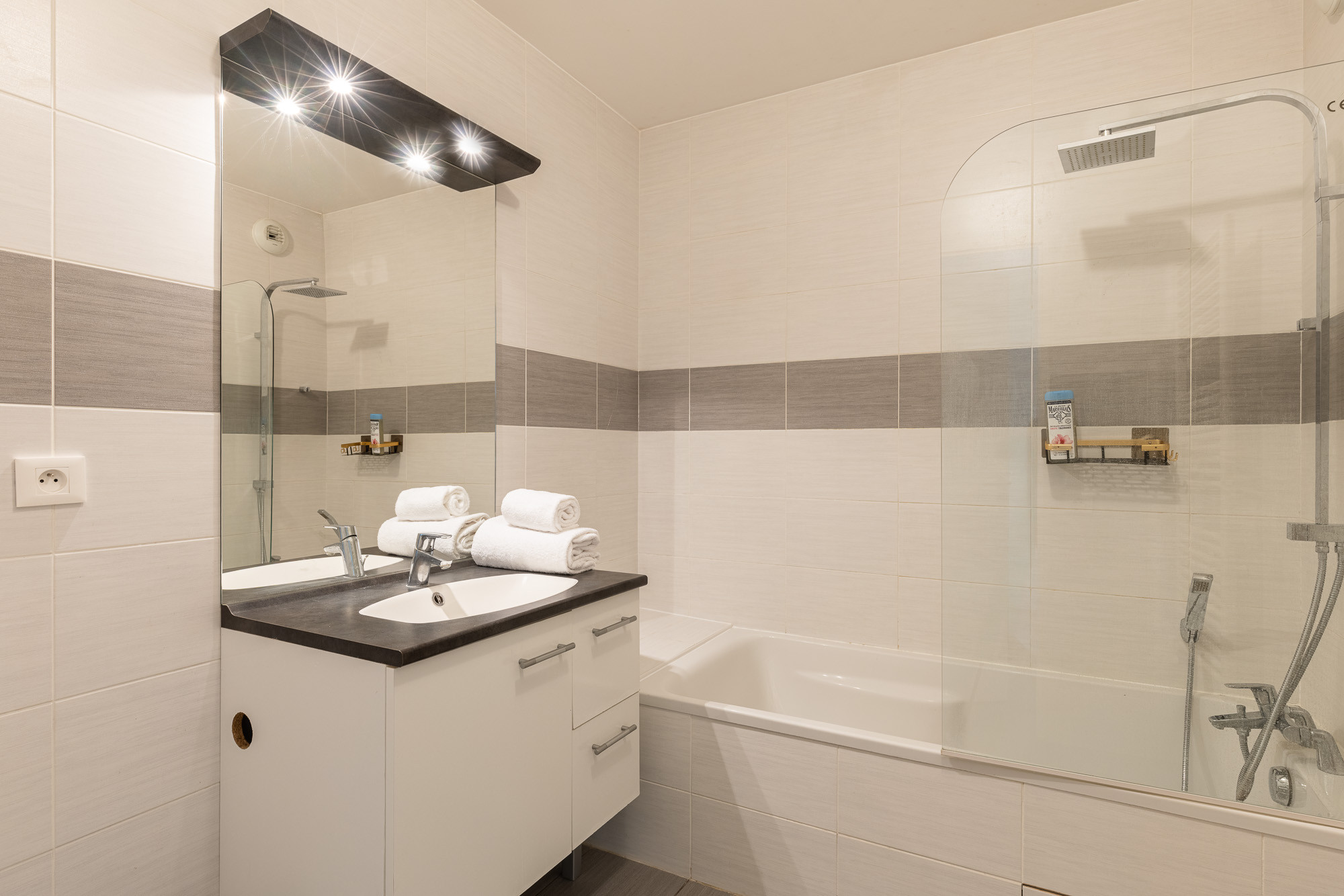 La salle de bain comprend une baignoire avec une paroie vitrée, une vasque et un chauffe serviette électrique.