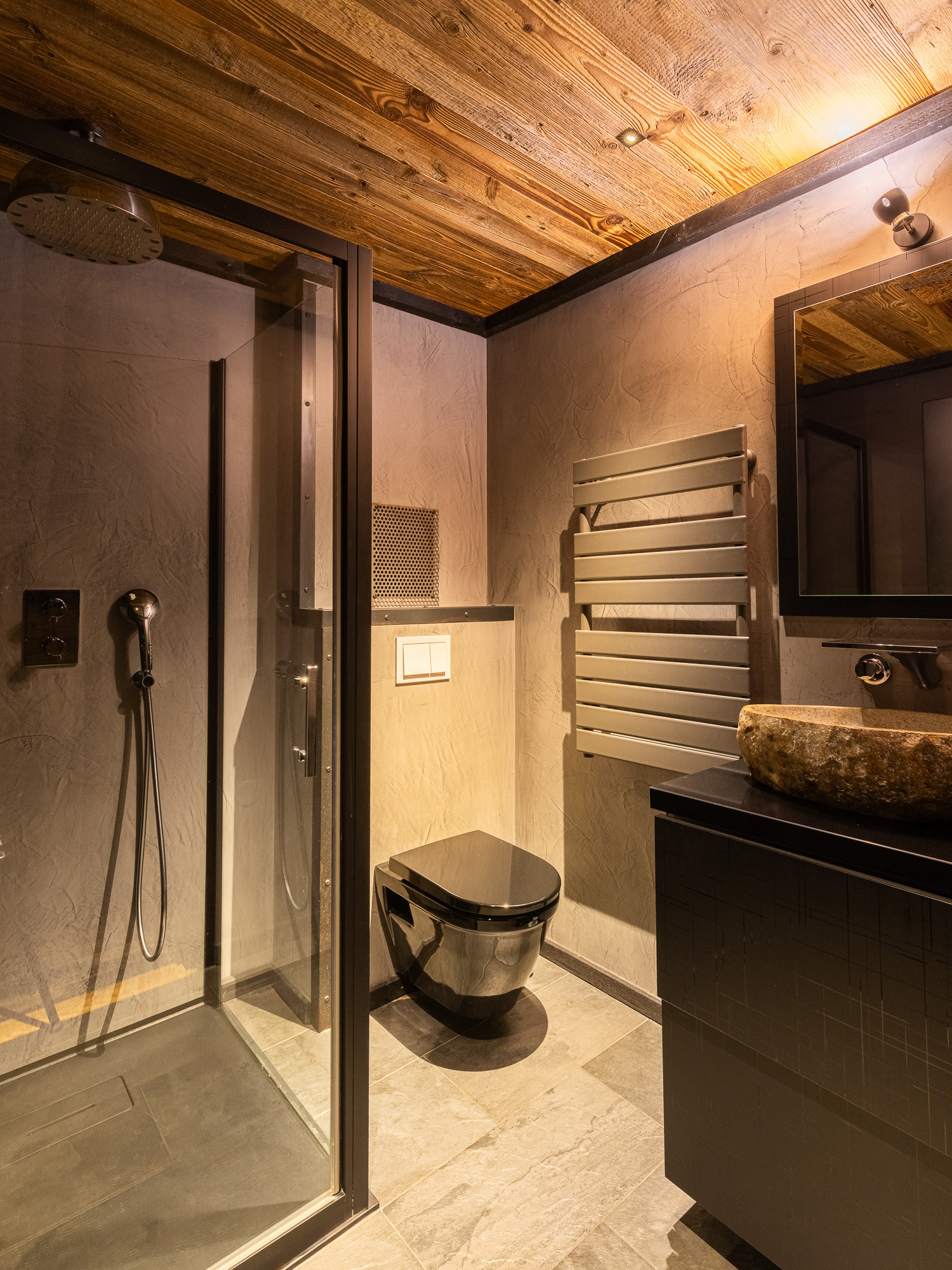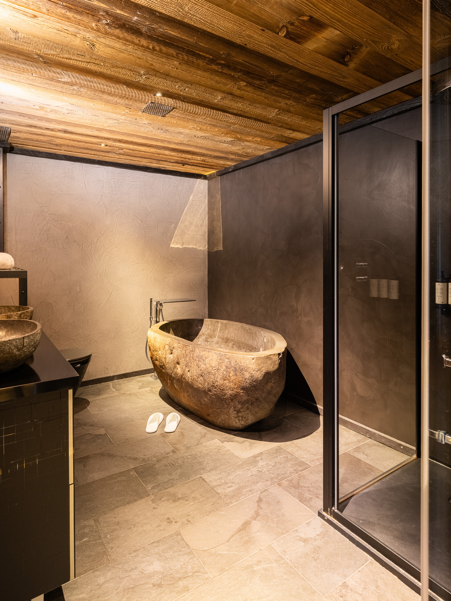 Certaines chambres sont équipées de lits aux dimensions exceptionnelles, véritables invitations au repos, tandis que les salles de bain séduisent par leurs baignoires sculptées dans la pierre, idéales pour se détendre après une journée de ski.