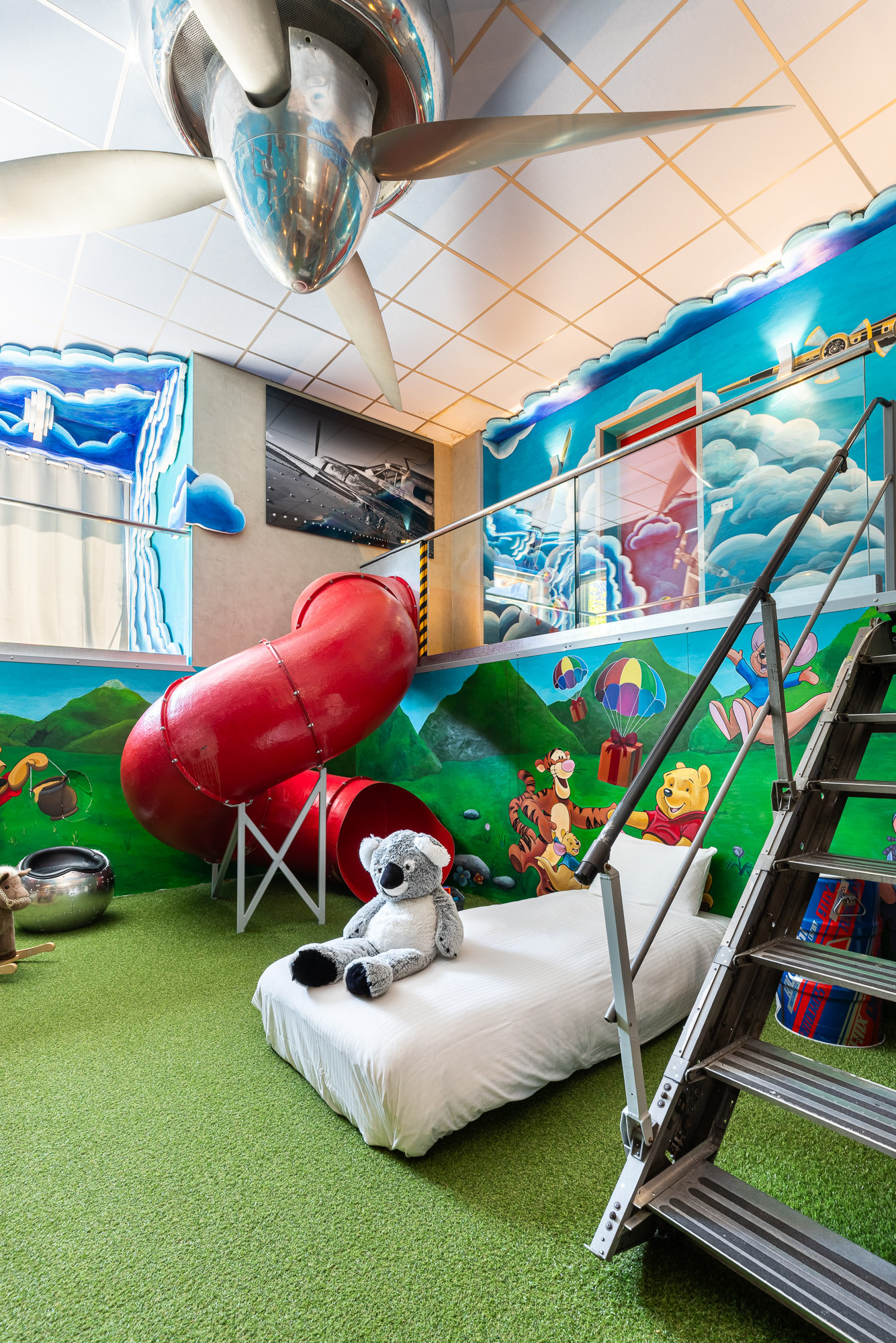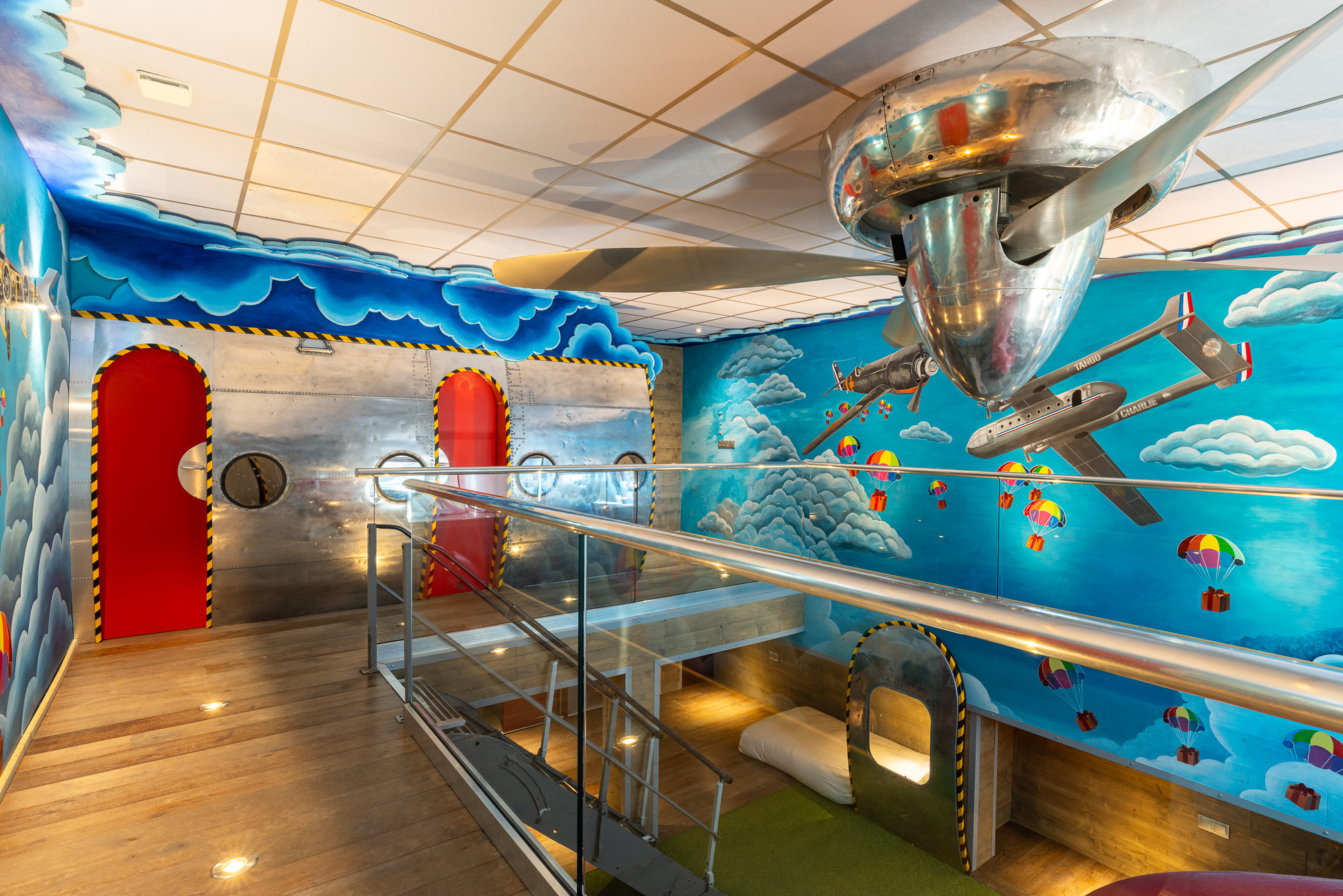 Chaque espace révèle une atmosphère singulière : une table conçue à partir d’un moteur d’avion, une salle de jeux intégrée dans un fuselage pour les enfants, ou encore une aile d’avion transformée en table de dîner. Ces détails insolites confèrent au lieu un caractère exceptionnel.